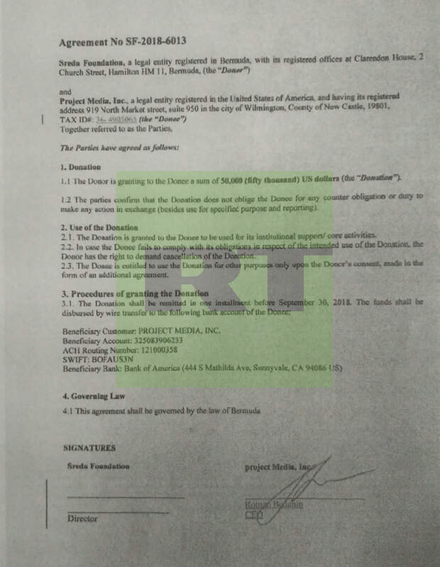 В отличие от многостраничных соглашений с американским NED с дополнительными соглашениями и описанием детальной отчётности, договор бермудского фонда Sreda Foundation о гранте в $50 тыс. для Project Media занимает одну страницу.