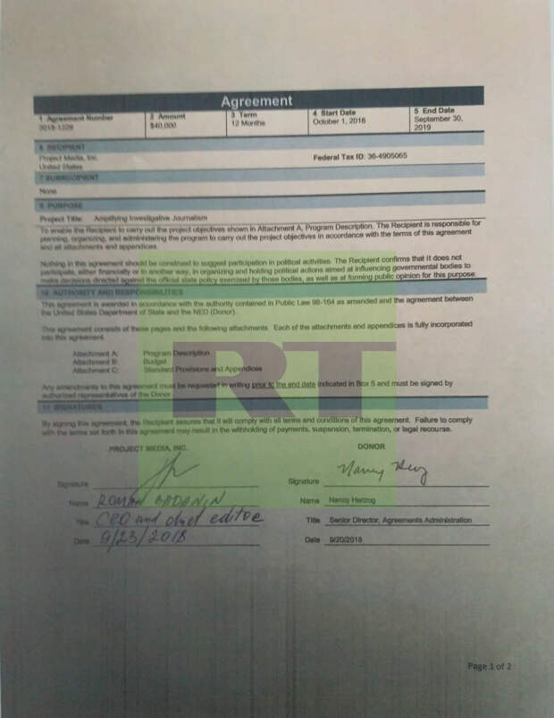 В распоряжении RT также оказались документы NED с деталями выдачи «Проекту» еще $40 тыс. Это финансовые бумаги, выписки и часть текстовых отчётов Баданина перед американскими спонсорами.