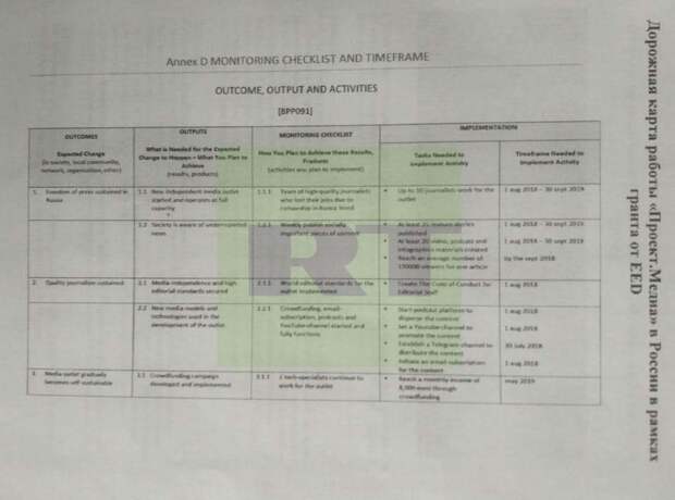 Согласно дорожной карте по исполнению соглашения с EED, одна из ключевых целей гранта — «поддержание свободы СМИ в России». Для этого предполагалось учредить новое мультимедийное СМИ, которое еженедельно публиковало бы важные заметки на социальные темы. Однако требования в документе заставляют забыть о том, что речь идёт о гранте, — больше они похожи на те, которые публикуют заказчики по госконтрактам: в «дорожной карте» расписано, какие именно задачи нужно выполнить. Так, в сентябре 2019-го, к концу действия соглашения, EED рассчитывал получить в обмен на перечисленную сумму не менее 20 видео, подкастов и материалов инфографики, 35 «тематических статей». А количество просмотров каждой заметки должно было быть не меньше 150 тыс.