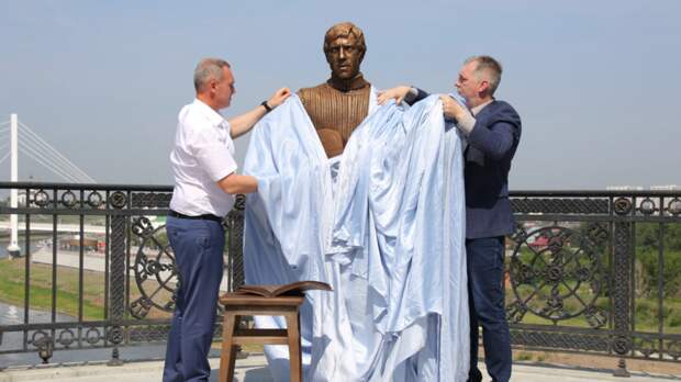 Памятник открыли глава города Руслан Кухарук и сын поэта Никита Высоцкий.