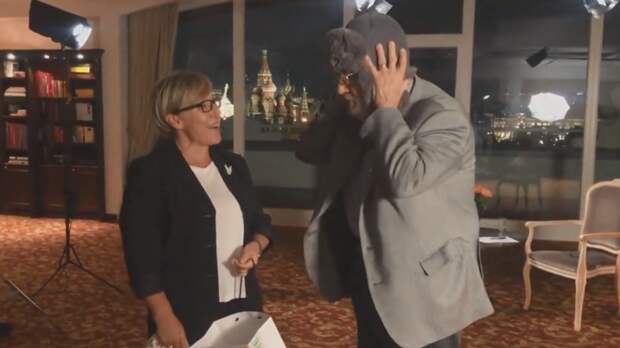 Испанский оперный певец Пласидо Доминго получил в подарок от телеканала RT фирменную шапку-ушанку и примерил её.
