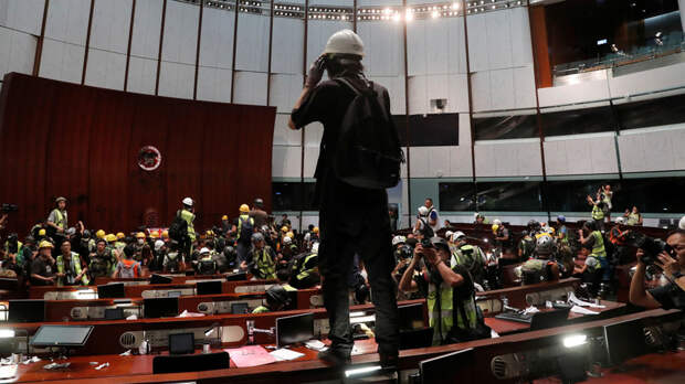 Ранее толпа протестующих ворвалась в законодательную палату Гонконга после многочасовой акции протеста около здания. Участники беспорядков разбили стеклянные элементы здания и начали отрывать металлические элементы отделки.