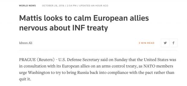 Между тем глава Пентагона Джеймс Мэттис, прибывший с визитом в Европу, сообщил о проведении консультации по ДРСМД с союзниками по НАТО. По мнению экспертов, уровень безопасности европейских стран значительно понизится в случае разрыва соглашения. В ЕС хорошо это осознают и осуждают инициативу Белого дома по расторжению договора, подчёркивают политологи.Решение Соединённых Штатов выйти из Договора о нераспространении ракет средней и меньшей дальности воспринимается Россией как уже свершившийся факт. Об этом заявил глава МИД РФ Сергей Лавров.