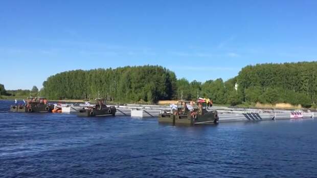 Военнослужащие понтонных взводов сбросили звенья понтона в воду, где их собрали в наплавной мост. Это позволило отремонтировать «повреждённый» автомобильный мост и восстановить движение.