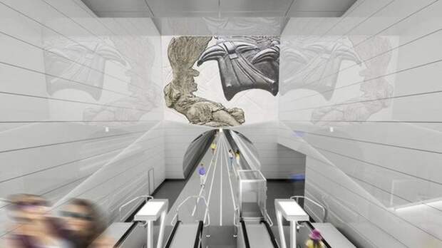 В торцах станции разместят рельефы древнегреческой богини Ники и человека в костюме для вингсьютинга.