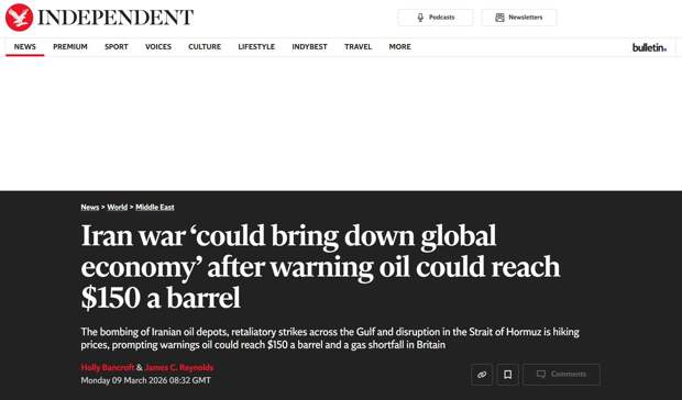 Так, заголовок The Independent гласит: «Война с Ираном может обрушить мировую экономику». С соответствующим предупреждением выступил министр энергетики Катара Саад аль-Кааби, передаёт британская газета. По словам аль-Кааби, его стране потребуются «недели или месяцы», чтобы вернуться к нормальному режиму поставок, а Европа, вероятно, пострадает от резкого скачка цен.