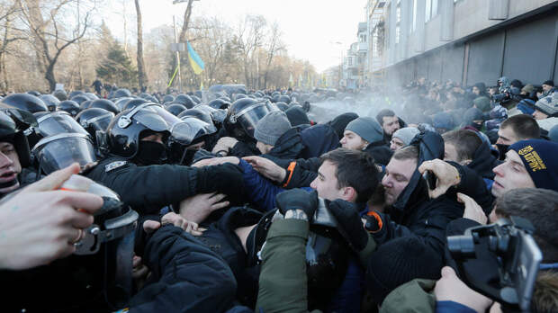 Столкновения начались после того, как участники акции протеста в Киеве попытались установить на проезжей части на улице Грушевского военную палатку.