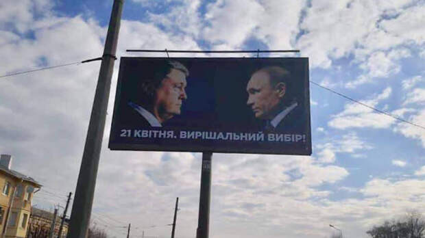 Кроме того, перед вторым туром в украинских городах появились билборды, на которых слева изображён Пётр Порошенко, а справа — Владимир Путин. Внизу надпись: «21 апреля. Решающий выбор».