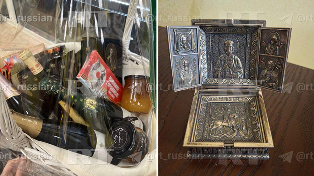 Владелец подмосковной пекарни «Машенька» Денис Максимов показал RT складень с иконами, который ему передали в качестве подарка от президента России Владимира Путина. Как уточняет Telegram-канал RT, в ответном подарке президента также была корзина с мёдом, вином и шоколадом. Ранее сообщалось,... Далее
